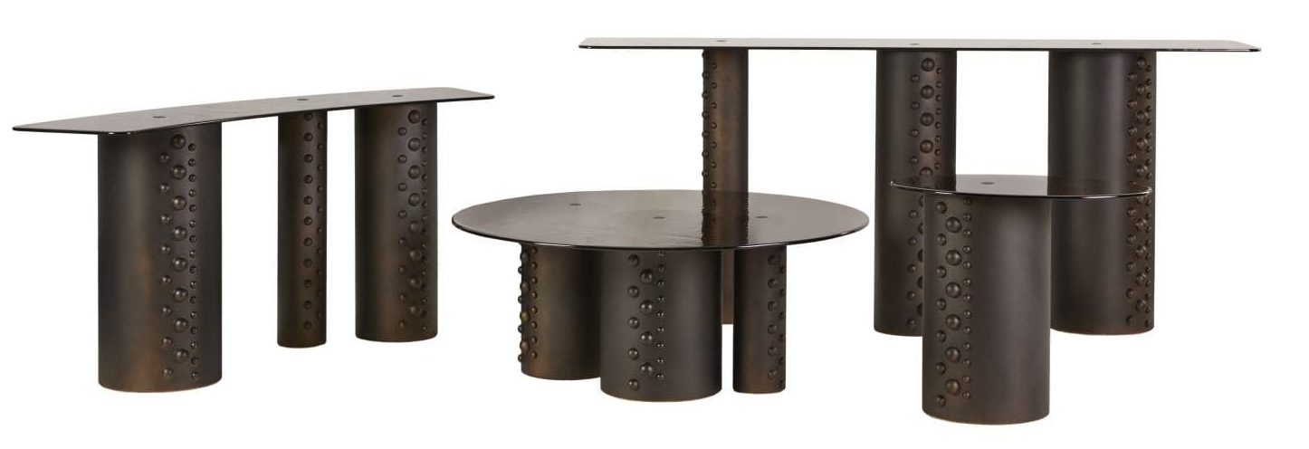 Our Column range introduces a statement of bold elegance to any room, through a 4-piece collection comprising dining, console, coffee and side table. Columns form the supporting base, each featuring a unique riveted detail finished in bronze or brass patina. The base columns are complemented by a textured glass or Italian Calacatta Viola marble table top.